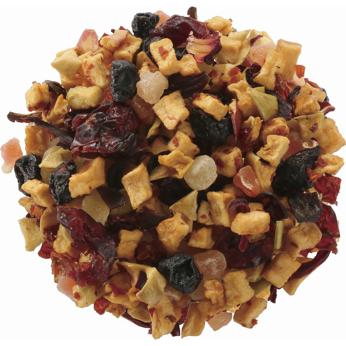 有機ドライアップル(オーストリア製造)、加糖ドライパパイヤ、加糖ドライマンゴー、加糖ドライクランベリー、加糖ドライブルーベリー、有機ハイビスカス、/香料、クエン酸、保存料(亜硫酸塩)